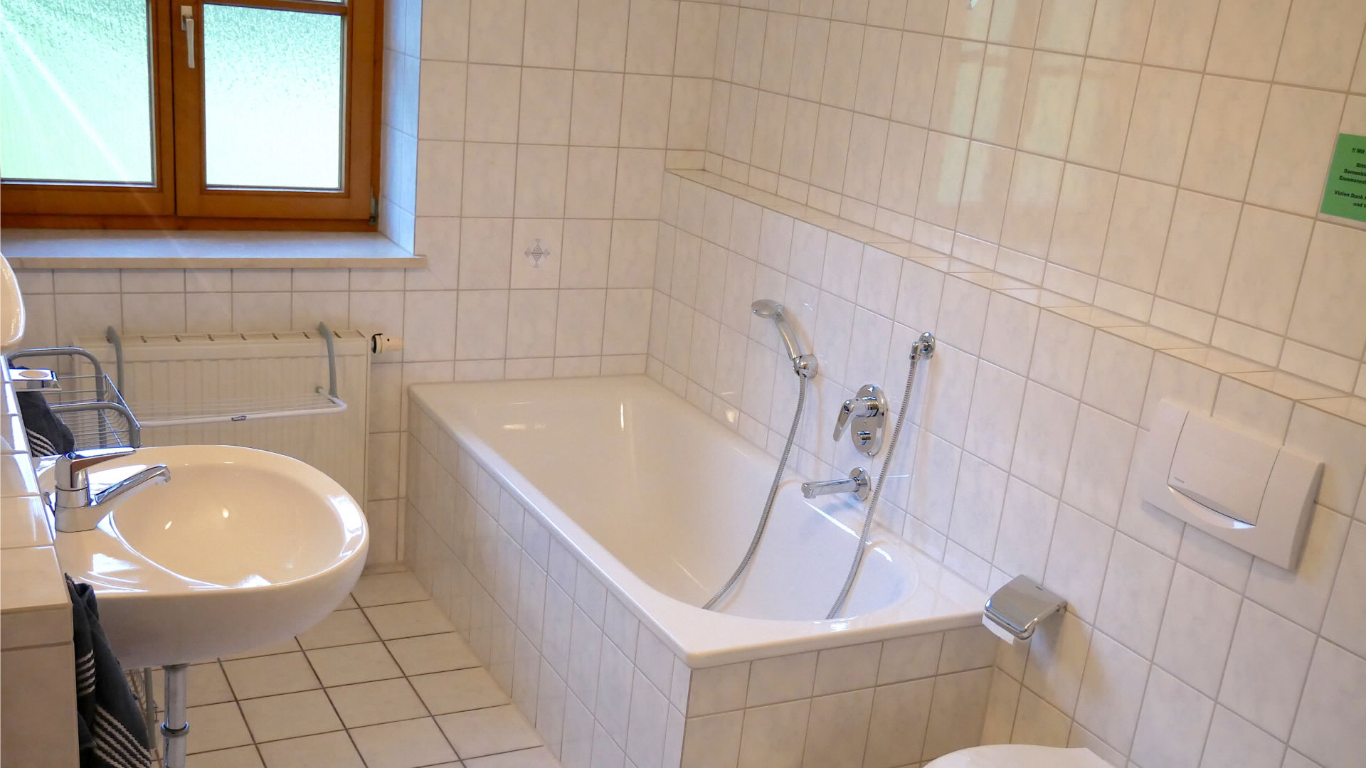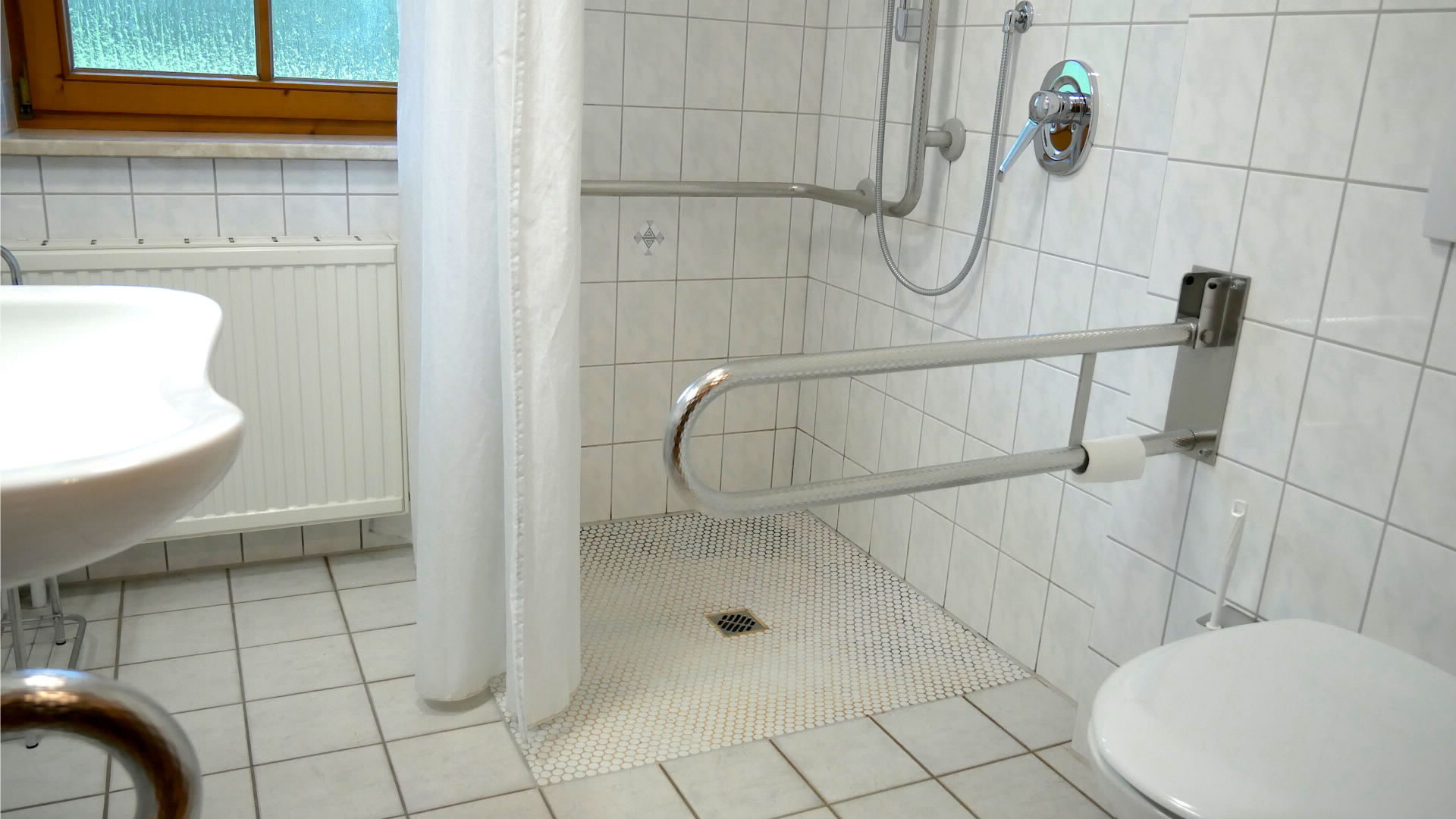 Terrasse und Wohnung über Rollstuhlrampe zu erreichen, Schlafzimmer, Wohnküche und Badezimmer mit Dusche, Waschgelegenheit und WC (Metertüren und keine Schwellen). Unterfahrbares Waschbecken, Haltegriff an WC & Waschbecken, Kippspiegel befahrbare Dusche - Duschsitz, Nichtraucherhaus.