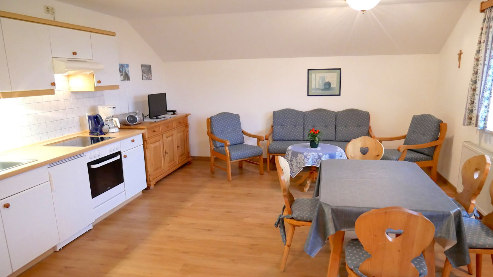Wohnküche, Schlaf- & Kinderzimmer separat, großzügiges Bad mit Dusche/WC, Zentralheizung, Parkplätze, AT-TV, Gästewaschküche, Tisch- und Bettwäsche vorhanden, Geschirr-, Dusch- & Handtücher vorhanden, Fön & Kosmetikspiegel, Nichtraucherhaus.