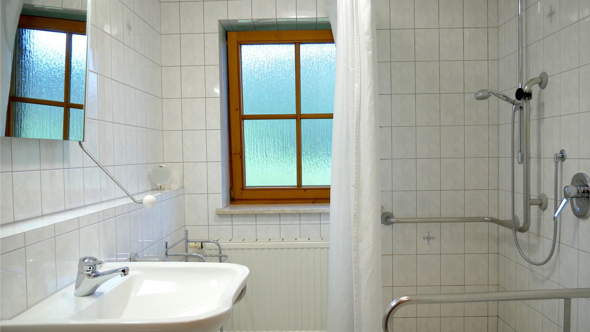 Terrasse und Wohnung über Rollstuhlrampe zu erreichen, Schlafzimmer, Wohnküche und Badezimmer mit Dusche, Waschgelegenheit und WC (Metertüren und keine Schwellen). Unterfahrbares Waschbecken, Haltegriff an WC & Waschbecken, Kippspiegel befahrbare Dusche - Duschsitz, Nichtraucherhaus.